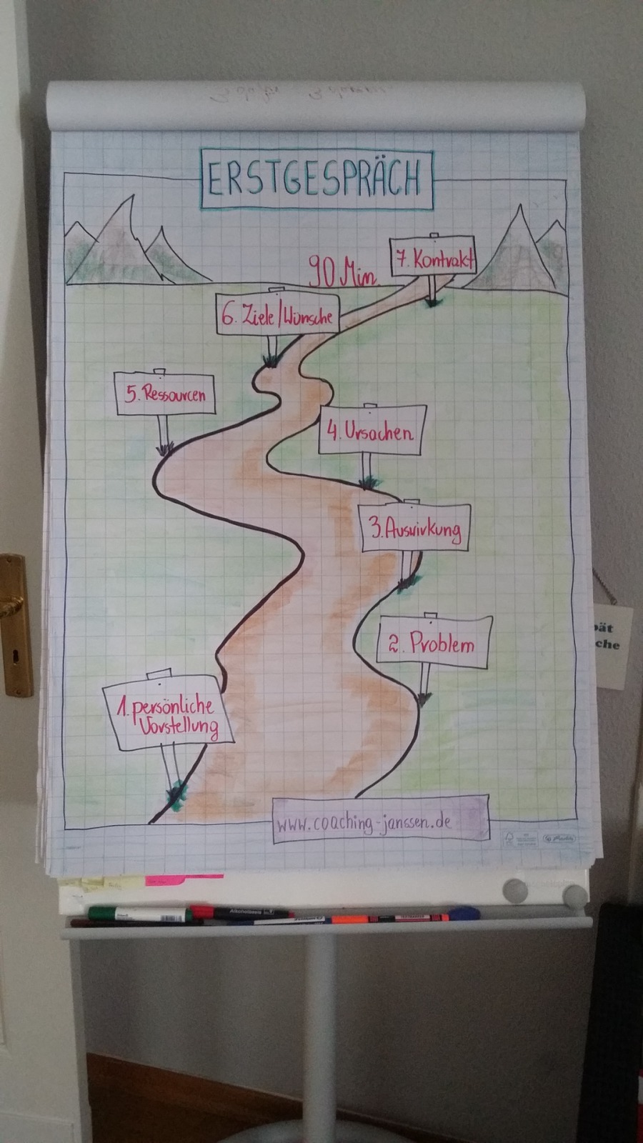 Die erste Sitzung gestalte ich sehr strukturiert und Sie erhalten von mir stets via Flipcharts visuelle Unterstützung. Wir gehen dann in den 120 Minuten gemeinsam folgende Punkte durch: